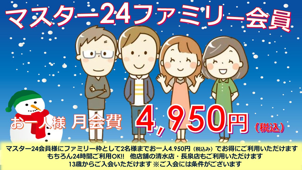 | マスター24ファミリー | 4,950円 | - | 5,500円 | マスター24会員様同居のご家族2名様まで入会可能。 親会員と同様のサービスが受けられてお得。中学生からご利用いただけます。 |