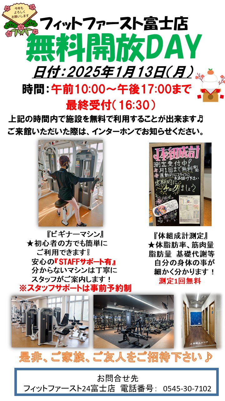 さて、フィットファースト富士店では、 2025年1月13日(月)に、無料開放DAYをおこないます(^O^)/